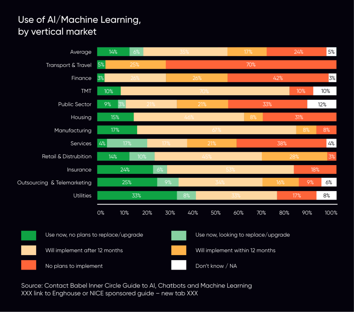 There are a lot of remarkable statistics about the prevalence of AI and chatbots. However, research by Contact Babel indicates that at present only 20% of UK Contact Centres are using AI or Machine Learning and there are massive variances in take-up depending on industry sector: