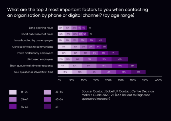 A study by Aurora Market Research into 1,000 UK consumers commissioned by Contact Babel identified the most important factors to a customer when contacting an organisation: