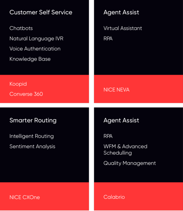 In this section we look at the four main categories of AI-enabled contact centre solutions: